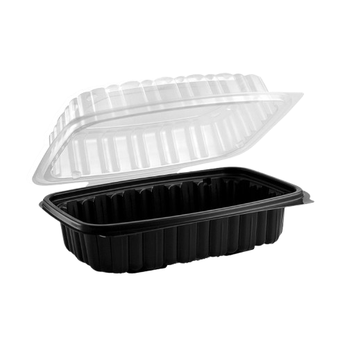 Description: Anchor Packaging Black Bottom Clear Top Hinged Microwaveable Container 1 Compartment 9.55" Width x 6.65" Depth x 3.04" Height