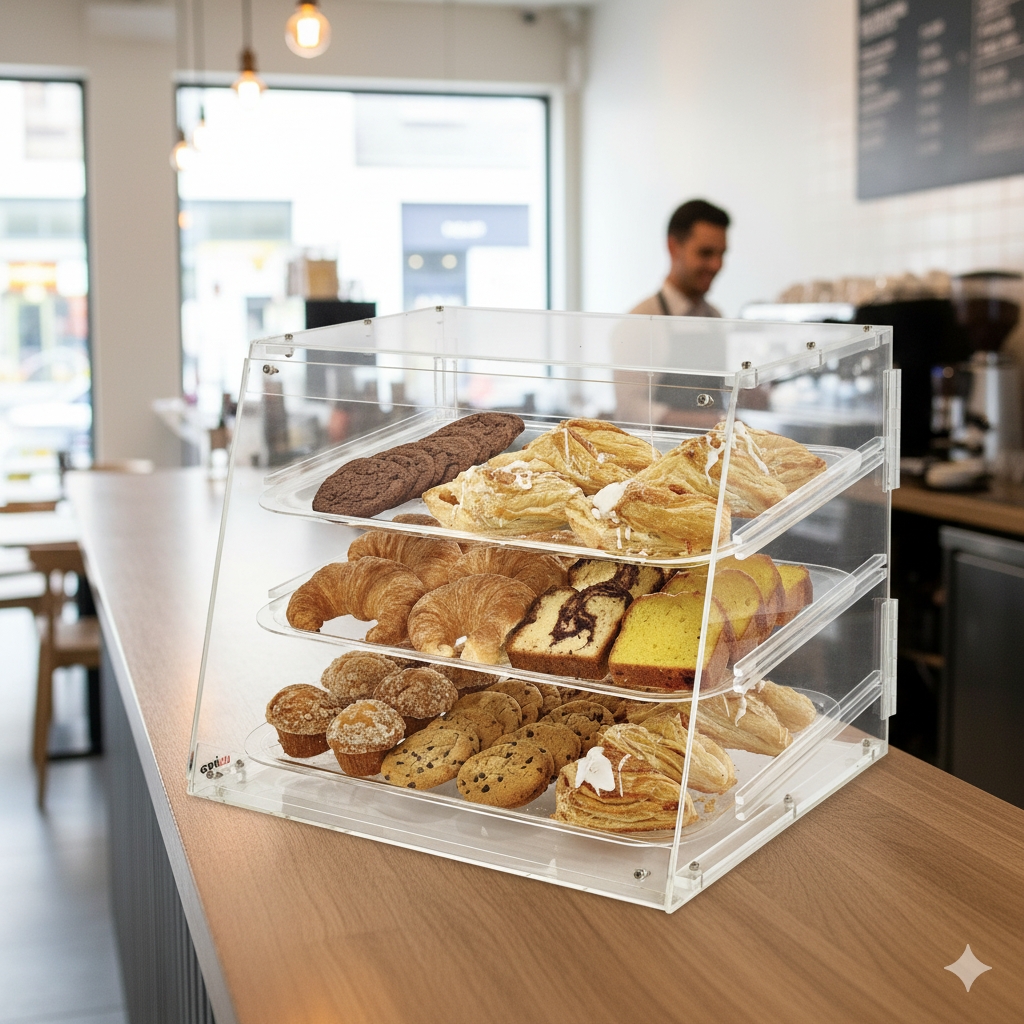 Description: Display case, 21" x 18" x 16-1/2"H, counter-top, rear door, includes: (3) 12" x 18" trays, acrylic, clear