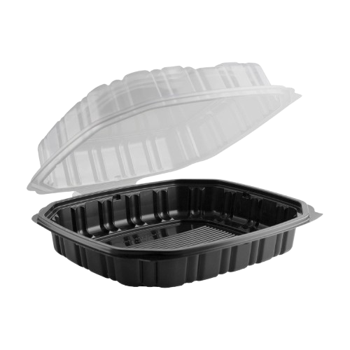 Description: Anchor Packaging Black Bottom Clear Top Hinged Microwaveable Container 1 Compartment 10.56" Width x 9.98" Depth x 3.18" Height