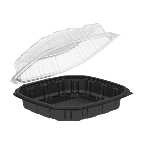 Description: Anchor Packaging Black Bottom Clear Top Hinged Microwaveable Container 1 Compartment 9.48" Width x 9.06" Depth x 3.01" Height