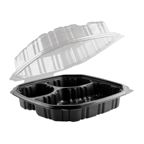 Description: Anchor Packaging Black Bottom Clear Top Hinged Microwaveable Container 3 Compartment 9.48" Width x 9.06" Depth x 3.01" Height