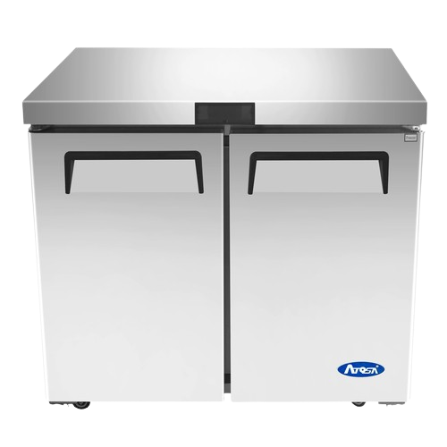 Description: Atosa Undercounter Freezer, reach-in, two-section, 36-1/8"W x 30"D x 34-1/8"H, rear-mounted self-contained refrigeration, 8.7 cu. ft., (2) hinged solid doors, digital temperature control, -8° to -1°F temperature range, (2) adjustable shelves, automatic evaporation, electric defrost, stainless steel interior & exterior, galvanized steel back, 2" casters, R290 Hydrocarbon refrigerant, 1/4 HP, 115v/60/1-ph, 2.6 amps, cord, NEMA 5-15P, cETLus, ETL-Sanitation