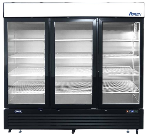 Description: Freezer Merchandiser, three-section, 81-9/10"W x 31-1/2"D x 81-1/5"H, bottom-mount self-contained refrigeration, 68 cu. ft., (3) self-closing hinged glass doors with locks, digital temperature control, -8° to 0°F temperature range, (12) adjustable shelves, LED interior lighting, automatic evaporation, electric defrost, stainless steel interior, black exterior, R290 Hydrocarbon refrigerant, 1 HP, 208-230/115v/60/1-ph, 6.2 amps, cord with NEMA L14-20P, cETLus, ETL-Sanitation