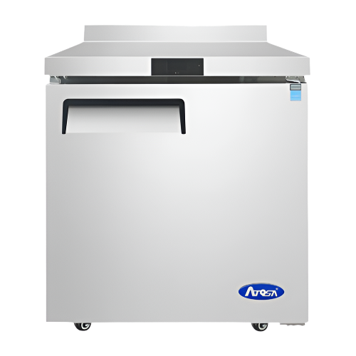 Description: Atosa Worktop Refrigerator, with backsplash, reach-in, one-section, 27-1/2"W x 30"D x 39-4/5"H, rear-mounted self-contained refrigeration, 7.2 cu. ft., (1) hinged solid door, digital temperature control, 33° to 40°F temperature range, (1) adjustable shelf, automatic evaporation, air defrost, stainless steel interior & exterior, galvanized steel back, 4" casters, R290 Hydrocarbon refrigerant, 1/7 HP, 115v/60/1-ph, 2.3 amps, cord, NEMA 5-15P, cETLus, ETL-Sanitation, ENERGY STAR®