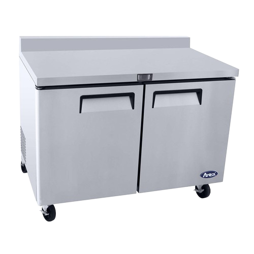 Description: Atosa Worktop Refrigerator, with backsplash, reach-in, two-section, 48-3/10"W x 30"D x 39-4/5"H, rear-mounted self-contained refrigeration, 13.4 cu. ft., (2) hinged solid doors, digital temperature control, 33° to 40°F temperature range, (2) adjustable shelves, automatic evaporation, air defrost, stainless steel interior & exterior, galvanized steel back, 4" casters, R290 Hydrocarbon refrigerant, 1/7 HP, 115v/60/1-ph, 2.3 amps, cord, NEMA 5-15P, cETLus, ETL-Sanitation, ENERGY STAR®