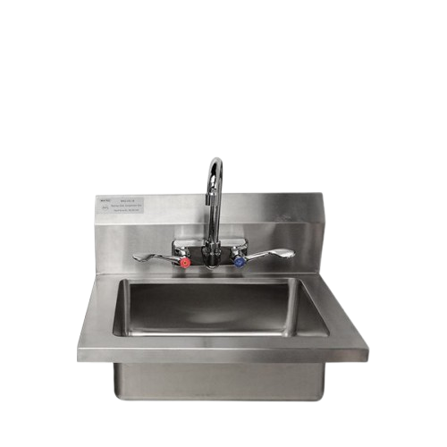 Description: MixRite Hand Sink, 18"W, wall mount, 14"W x 10" front-to-back x 5" deep bowl, 18/300 series stainless steel, 6"H backsplash with 2" return, 1-1/2" drain, includes: gooseneck faucet with wrist blade handles, strainer, Z-clip mounting bracket, NSF