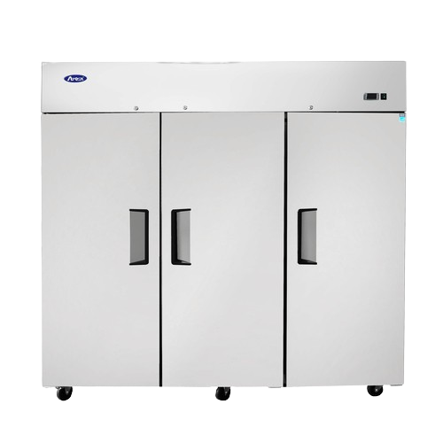 Description: Atosa Freezer, reach-in, three-section, 77-4/5"W x 33-3/10"D x 83"H, top mount self-contained refrigeration, 64.9 cu ft., (3) locking hinged solid doors, digital temperature control, -8° to 0°F temperature range, (9) adjustable shelves, interior LED lighting, automatic evaporation, electric defrost, stainless steel interior & exterior, galvanized steel back, 4" casters, R-404a refrigerant, 1-1/4 HP, 115/208-230v/60/1-ph, 5.5 amps, cord with NEMA L14-20P, cETLus, ETL-Sanitation