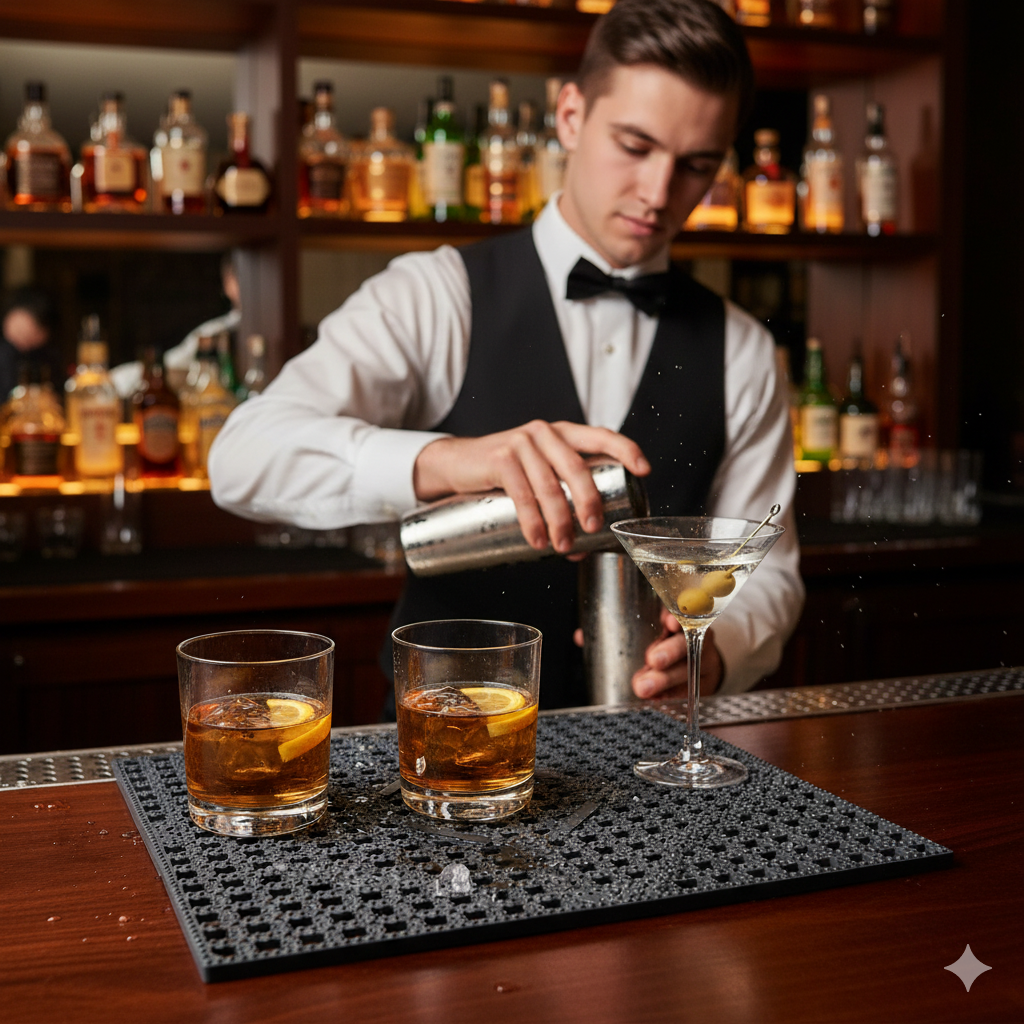 Description: Bar Mat, 12" x 12", square, interlocking, dishwasher safe, lightweight, plastic, dark smoke, NSF