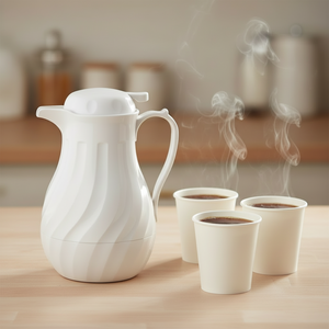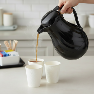 Description: Beverage Server, push button, 64 oz., double wall insulated, includes: tags for regular, decaf and tea, swirl design, plastic, black, NSF (hand wash only)