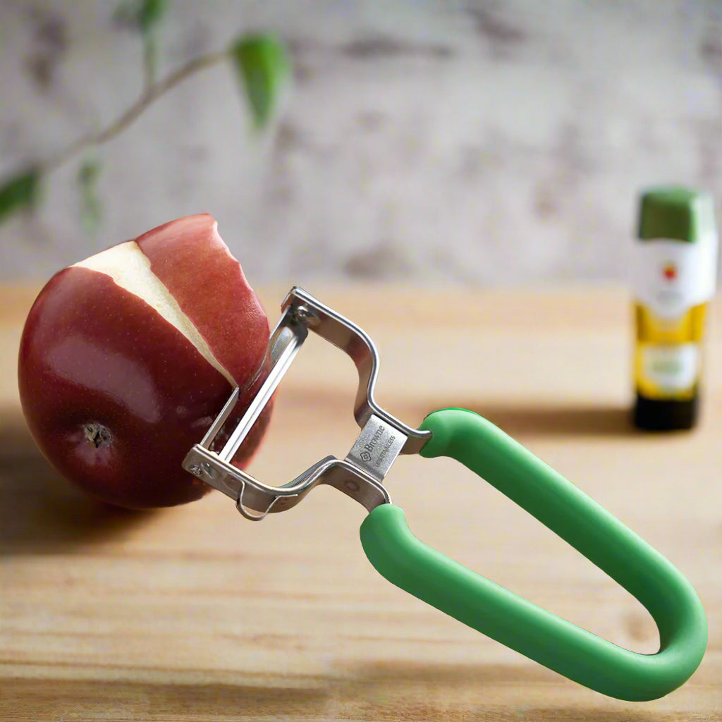 Description: Y Peeler, single scalpel blade with blade protector, integrated side cutter, soft TPE coated handle, Japanese stainless steel blade