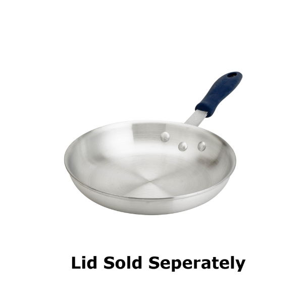 Description: Thermalloy® Fry Pan, 7" dia. x 1-3/10", without cover, handle with off-set rivets, ergonomic removable blue silicone heat resistant sleeve (to 572°F), operates with gas/electric/ceramic/halogen, heavy weight, 5 gauge, aluminum, natural finish, NSF