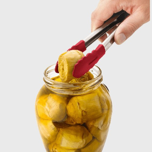 Description: CUISIPRO PICCOLO Mini Tongs 7"/18cm Red, 8.5" L X 1" W X 1" H, Fits into small spaces, ideal to pick up and release food easily, loop for hanging, stainless steel, LFGB standard silicone, dishwasher safe.