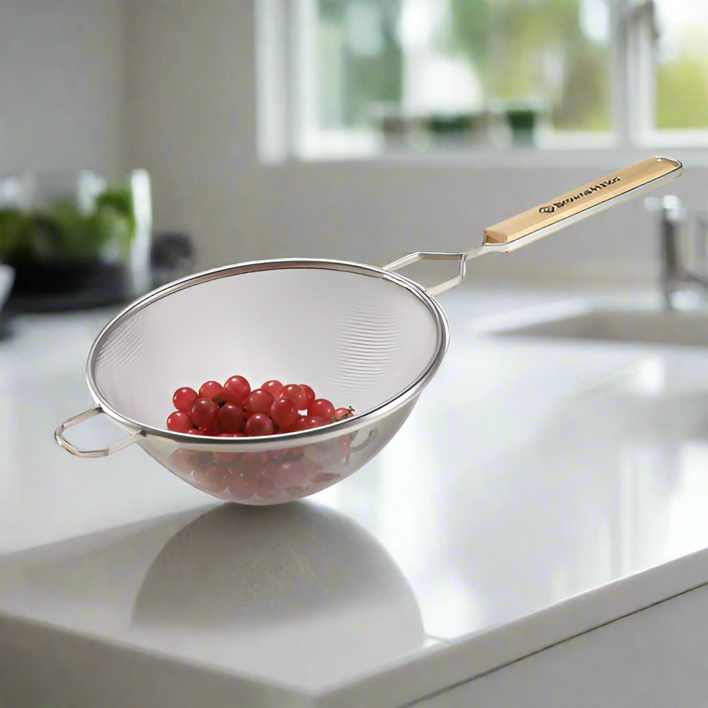 Description: Strainer, 6-4/5" bowl, 6"L handle, single medium mesh, wood flat-bottom handle, pan hook, reinforced wire rim, full-bathed tinned