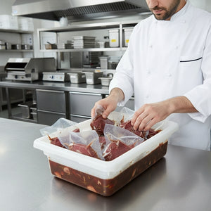 Description: Food Storage Container, 12" x 18" x 6", 3 gallon capacity, resist stains, dishwasher safe, polyethylene, natural white, NSF, Made in USA