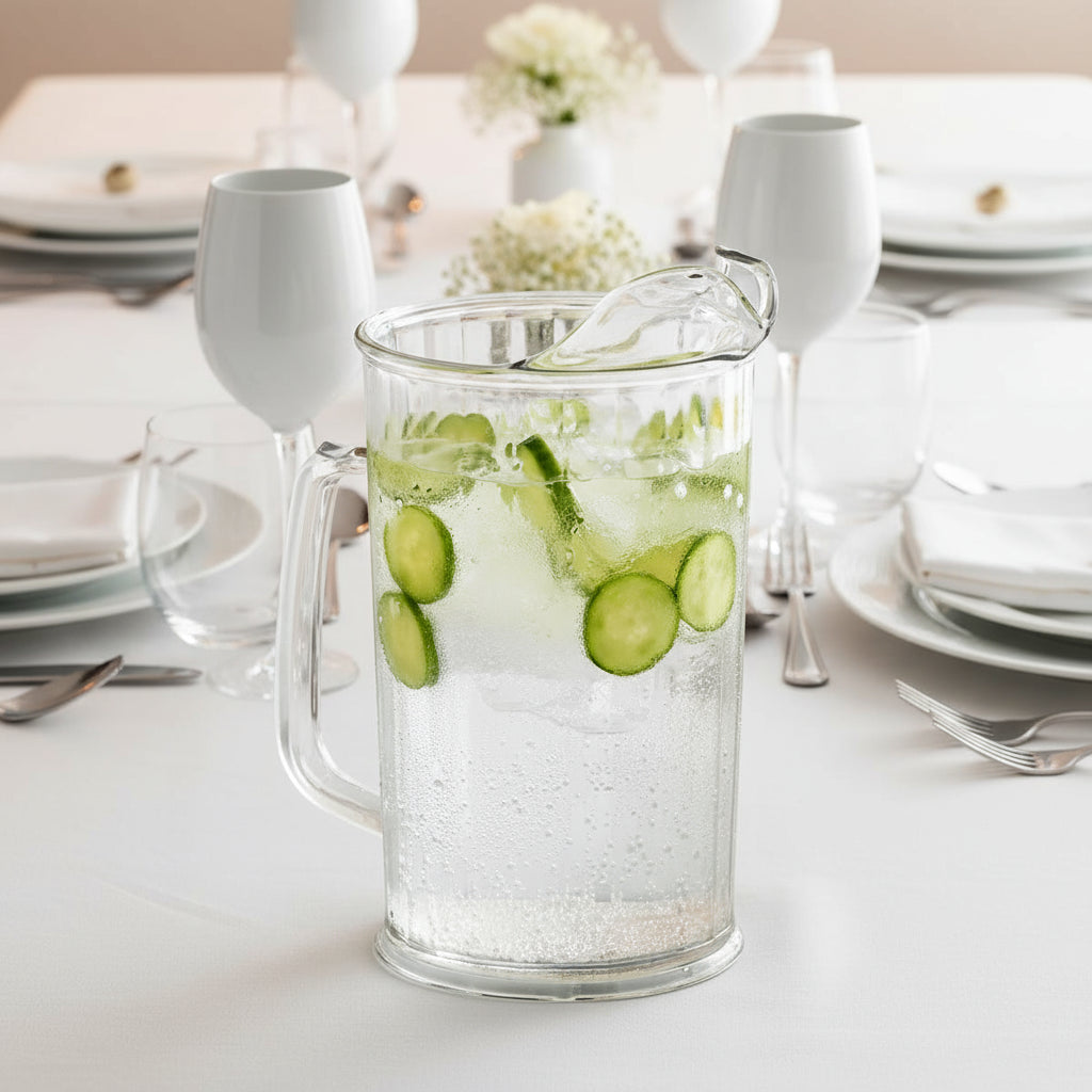 Description: Camwear® Pitcher, 60 oz., 7-1/4" dia. x 9"H, chip & break resistant, thumb-grip pour, contoured lip & pour spout, dishwasher safe, slotted base, polycarbonate, clear, NSF, Made in USA