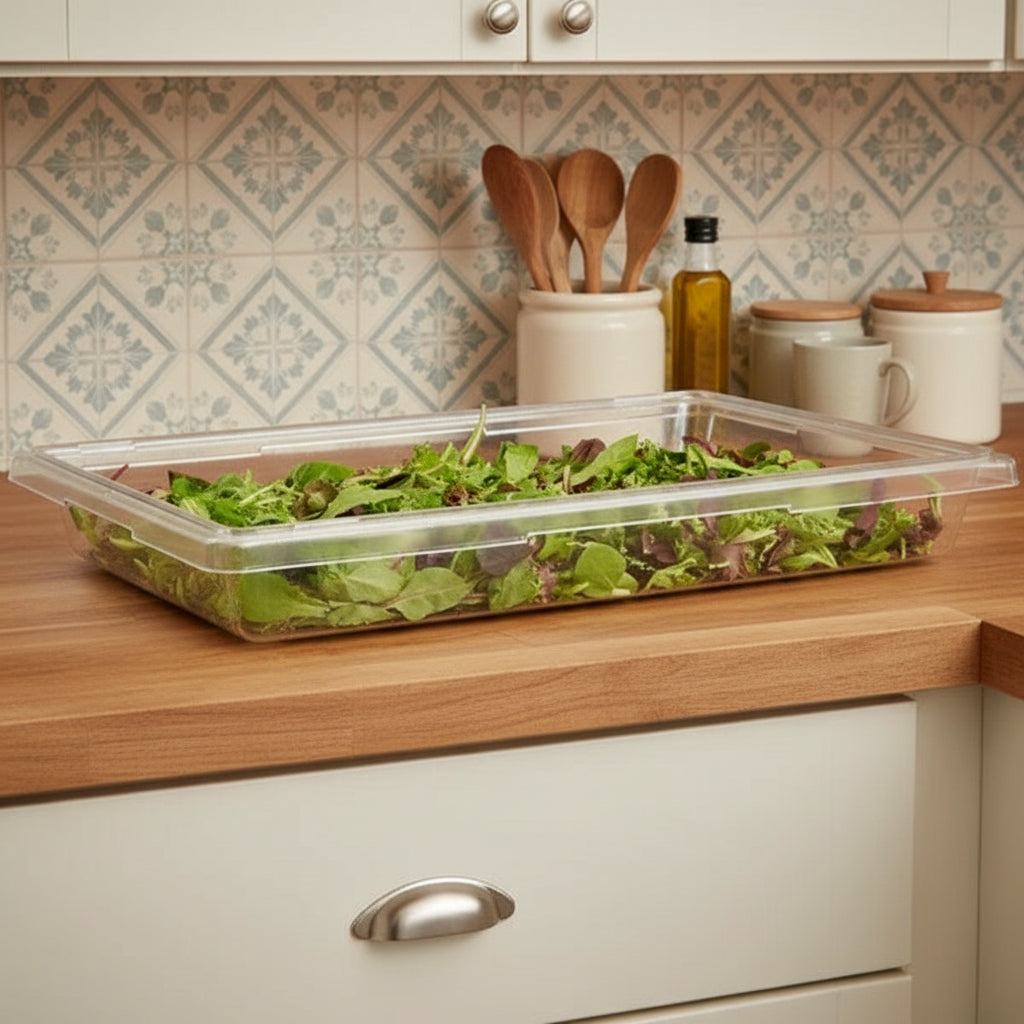Description: Camwear® Food Storage Container, 18" x 26" x 3-1/2", 5 gallon capacity, dishwasher safe, smooth surface, polycarbonate, clear, NSF, Made in USA