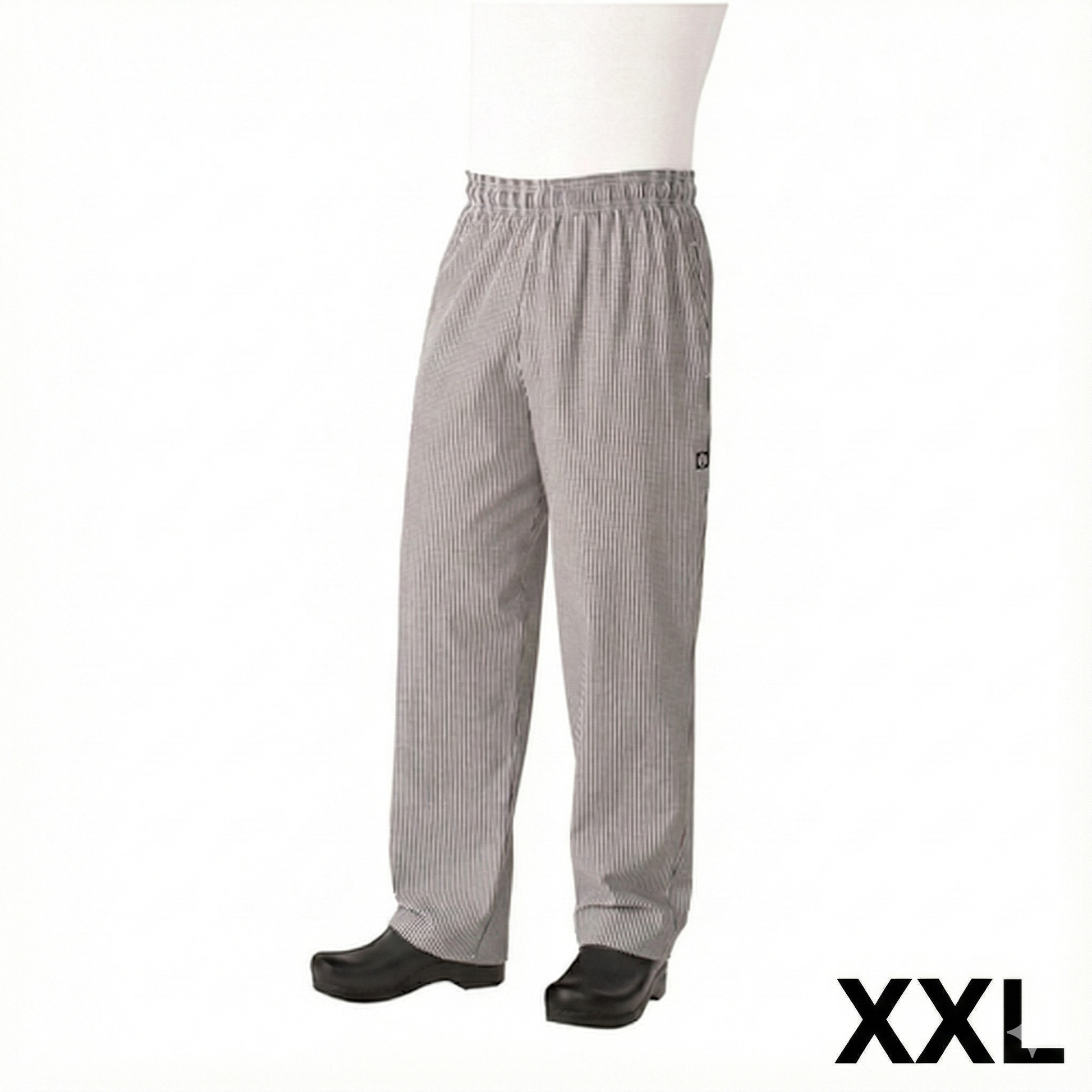 Description: Essential Baggy Pants, elastic waistband with drawstring, tapered legs, (2) side seam pockets, (1) back pocket, classic fit, 65/35 yarn-dyed poly/cotton, small black/white check, 2XL