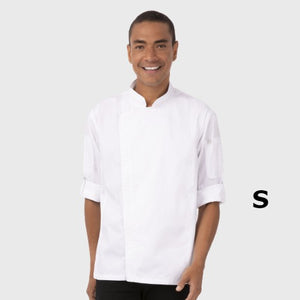 Description: Hartford Chef Coat, single-breasted, roll-up long sleeves with tab, 2-way separating zipper, Cool Vent™ sides and side seam slits, back collar apron holder with engraved snap, left sleeve rounded thermometer pocket, right sleeve rounded cell phone/notebook pocket, modern fit, 65/35 poly/cotton twill, gray, small