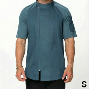 Description: Varkala Chef Coat, raglan short sleeve, off-set zip front with snap collar, side slits, left sleeve pocket, front concealed thermometer/pen pockets, back collar apron tab, color-matching knit mesh, 62/38 poly/cotton, 100% recycled polyester knit mesh, natural, S