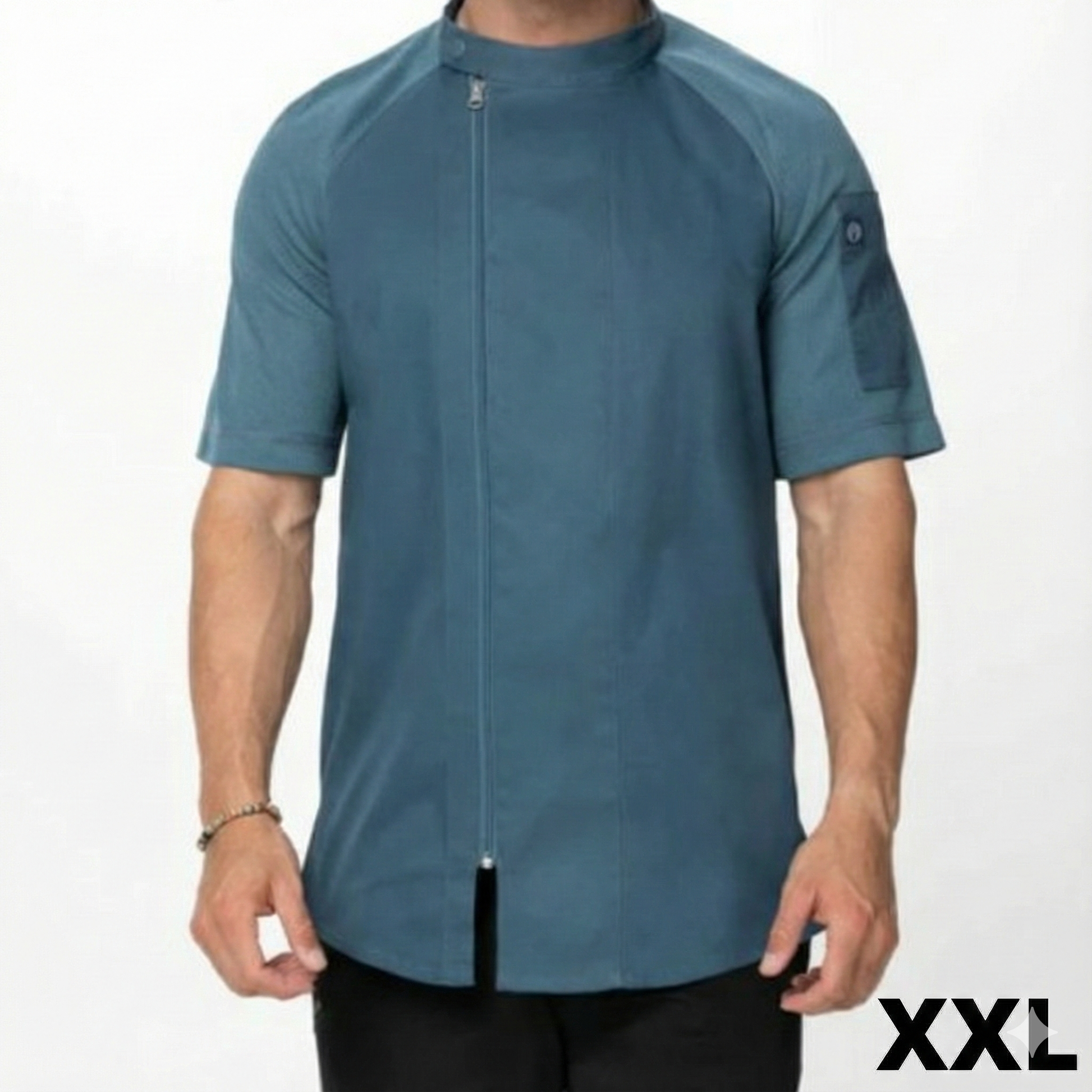 Description: Varkala Chef Coat, raglan short sleeve, off-set zip front with snap collar, side slits, left sleeve pocket, front concealed thermometer/pen pockets, back collar apron tab, color-matching knit mesh, 62/38 poly/cotton, 100% recycled polyester knit mesh, teal, 2XL