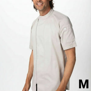 Description: Varkala Chef Coat, raglan short sleeve, off-set zip front with snap collar, side slits, left sleeve pocket, front concealed thermometer/pen pockets, back collar apron tab, color-matching knit mesh, 62/38 poly/cotton, 100% recycled polyester knit mesh, teal, M
