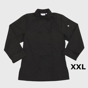 Description: Women's Sofia Chef Coat, double-breasted, long sleeves, turn-back cuffs, side seam slits, cloth-covered buttons, thermometer pocket, classic fit, 65/35 poly/cotton twill, black, XXL