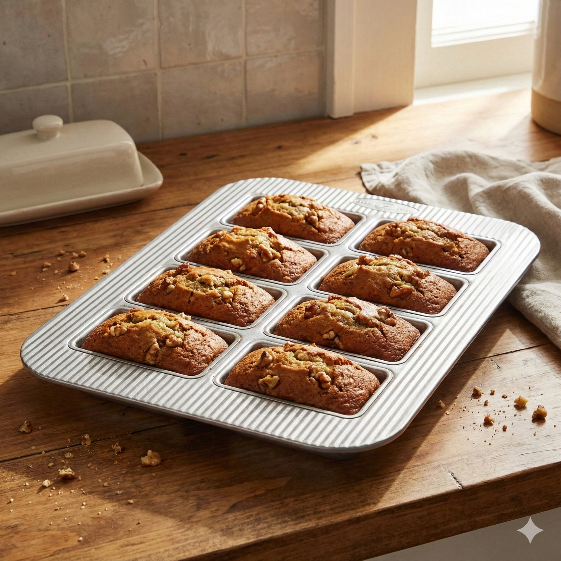 Description: Mini-Loaf Pan, 11-1/8" x 15-3/4" overall, makes (8) 3-7/8" x 2" mini loaves, 5.1 oz. capacity each, curled rim, hand wash recommended, 22 gauge panel/26 gauge cups, aluminized steel, AMERICOAT® ePlus silicone glaze, PFOA Free