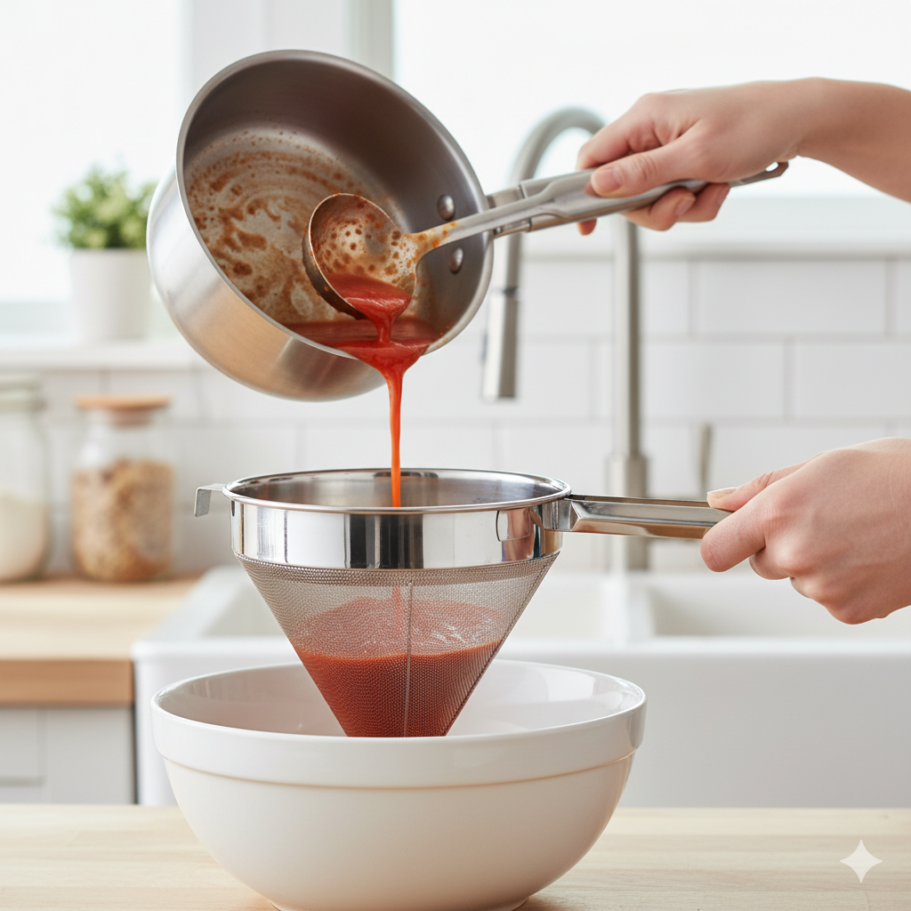 Description: China Cap Strainer, 12", fine, welded handle, 18/8 stainless steel