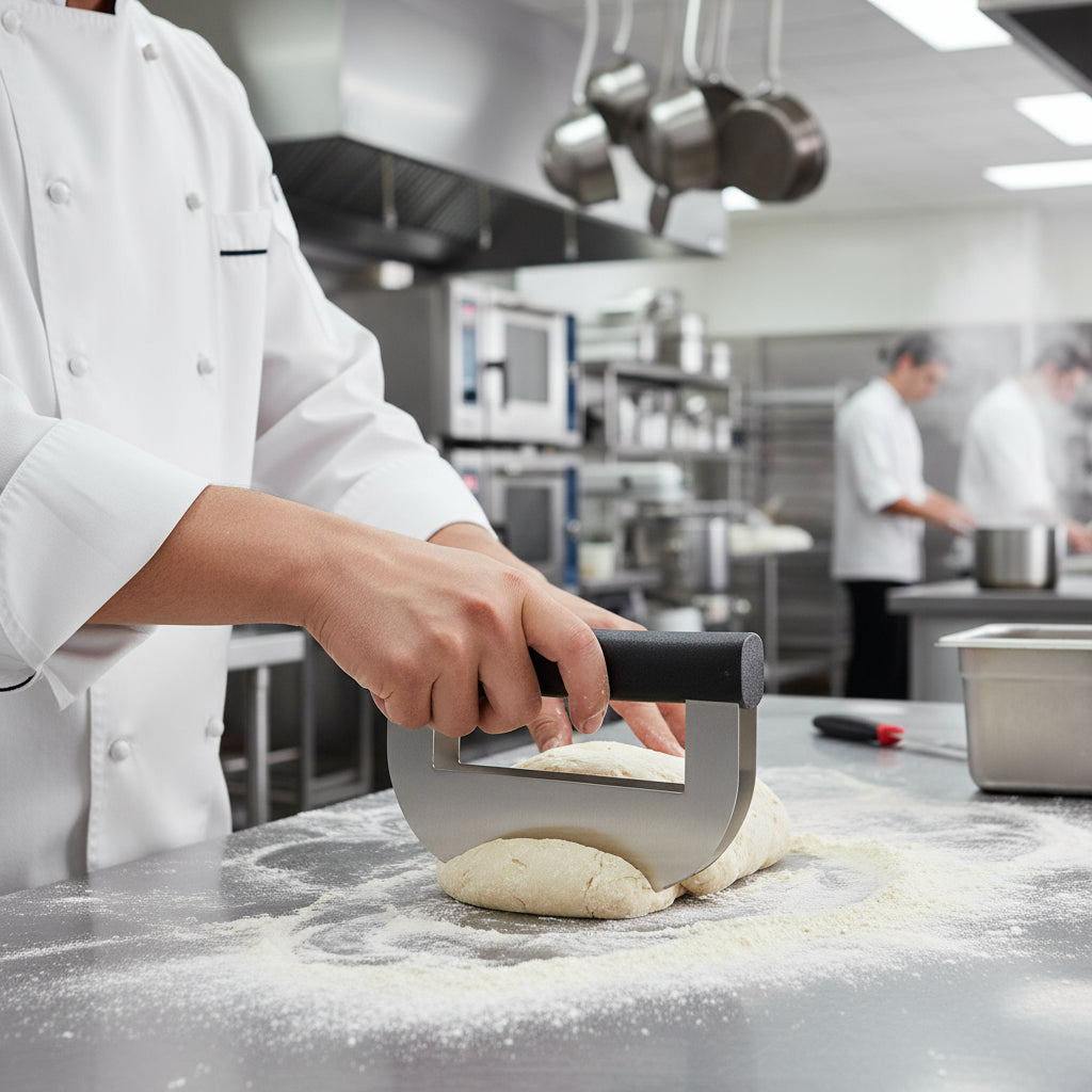 Description: Chopping Knife, 6-9/10"L x 4-3/5"W x 1"H, double blade with black polypropylene handle, NSF