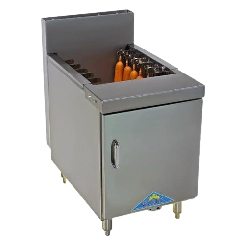 Description: Corn Dog Fryer, countertop, gas, 16" wide x 23 1/4" high to cook surface, 60-70 lb. fat capacity, includes (2) clip skewers, snap action thermostat, standing pilot, stainless steel fry tank, stainless steel exterior, 4" adjustable stainless steel legs, 80,000 BTU, Made in USA