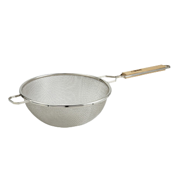 Description: Strainer, 10-1/2" bowl dia., 11-1/4"L handle, 23-3/4" O.A.L., round, double tinned mesh, medium, wood handle