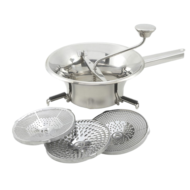 Description: Food Mill, 2 qt., medium, 9" dia., round, (3) interchangeable cutting plates, stainless steel