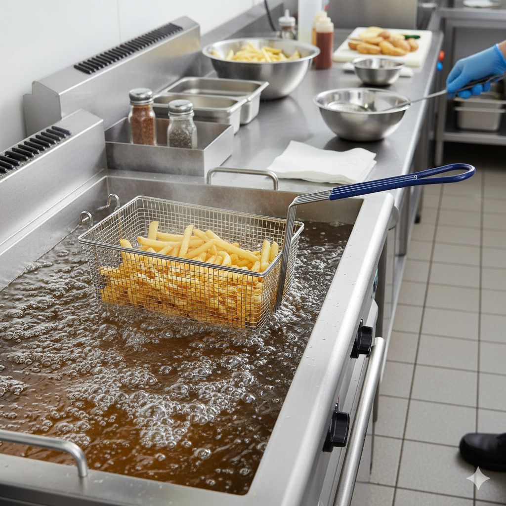Description: Fry Basket, 13-1/4"L x 5-3/4"W x 5-5/8"H, rectangular, one-piece, non-welded, 10-1/2" blue plastic handle, nickel plated