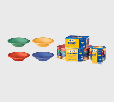 Description: Diamond Mardi Gras™ Bowl, 4-1/2 oz. (5 oz. rim full), 4-3/4" dia. x 1-1/4"H, round, break-resistant, dishwasher safe, BPA free, melamine, mix pack of 4 Mardi Gras™ colors (tropical yellow, rio orange, peacock blue & rainforest green), NSF (special packaging)