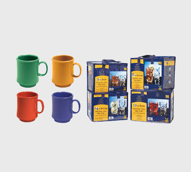 Description: Mug, 8 oz. (10 oz. rim full), 3-1/4" dia. x 3-3/4"H, stacking, shatter-resistant, dishwasher safe, BPA free, TRITAN, mix pack of 4 Mardi Gras™ (tropical yellow, rio orange, peacock blue & rainforest green), NSF (special packaging)