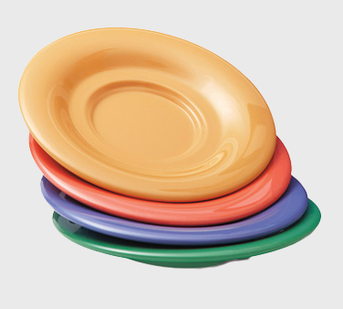 Description: Diamond Mardi Gras™/Bake & Brew™ Saucer, 5-1/2" dia., for C-108, TM-1208 & TM-1308, break-resistant, dishwasher safe, melamine, mix pack of 4 Mardi Gras™ colors (tropical yellow, rio orange, peacock blue & rainforest green), NSF