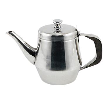 Description: Teapot, 20 oz., gooseneck, vented lid, Bakelite handle, stainless steel, mirror finish
