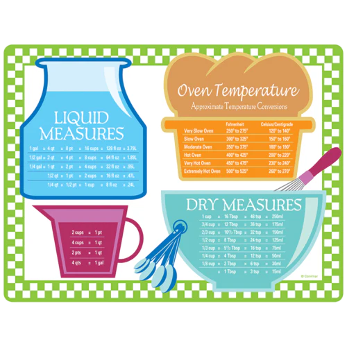 Description: Chop Chop Flexible Mats With Measures, 17-1/4" x 11-1/2" x .02", includes printed measurements (liquid, oven temperatures, dry measures), polypropylene
