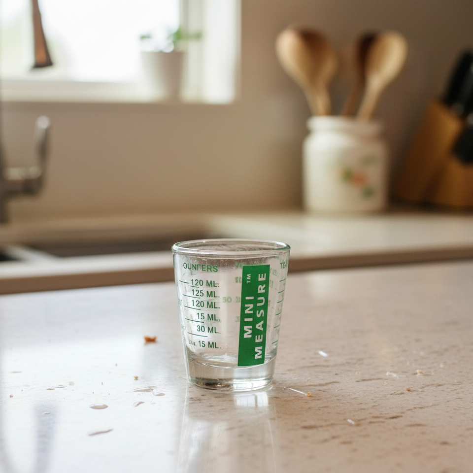Description: Kolder Mini Measure, 2" x 2" x 2-1/2", capacity: 1 oz., 2 tbsp, 6 tsp., glass, green