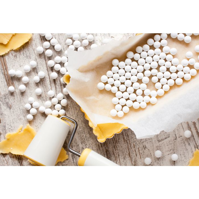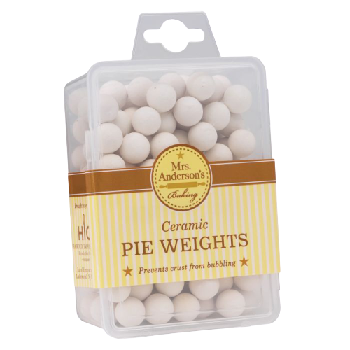 Description: Mrs. Anderson's Ceramic Pie Weights bake empty pie shells, known as blind baking, without them shrinking, bubbling or buckling, Made from natural, food-safe ceramic stoneware; heat resistant to 480-degrees Fahrenheit; includes convenient storage container, Individual beads are easy to place and arrange as needed; effectively weighs down pie dough to keep bubbles from forming and transfers heat evenly, Easy to use; great for any size frozen and homemade pie crust; wipe clean with a dry cloth or hand wash in warm, soapy water; dry thoroughly before storing