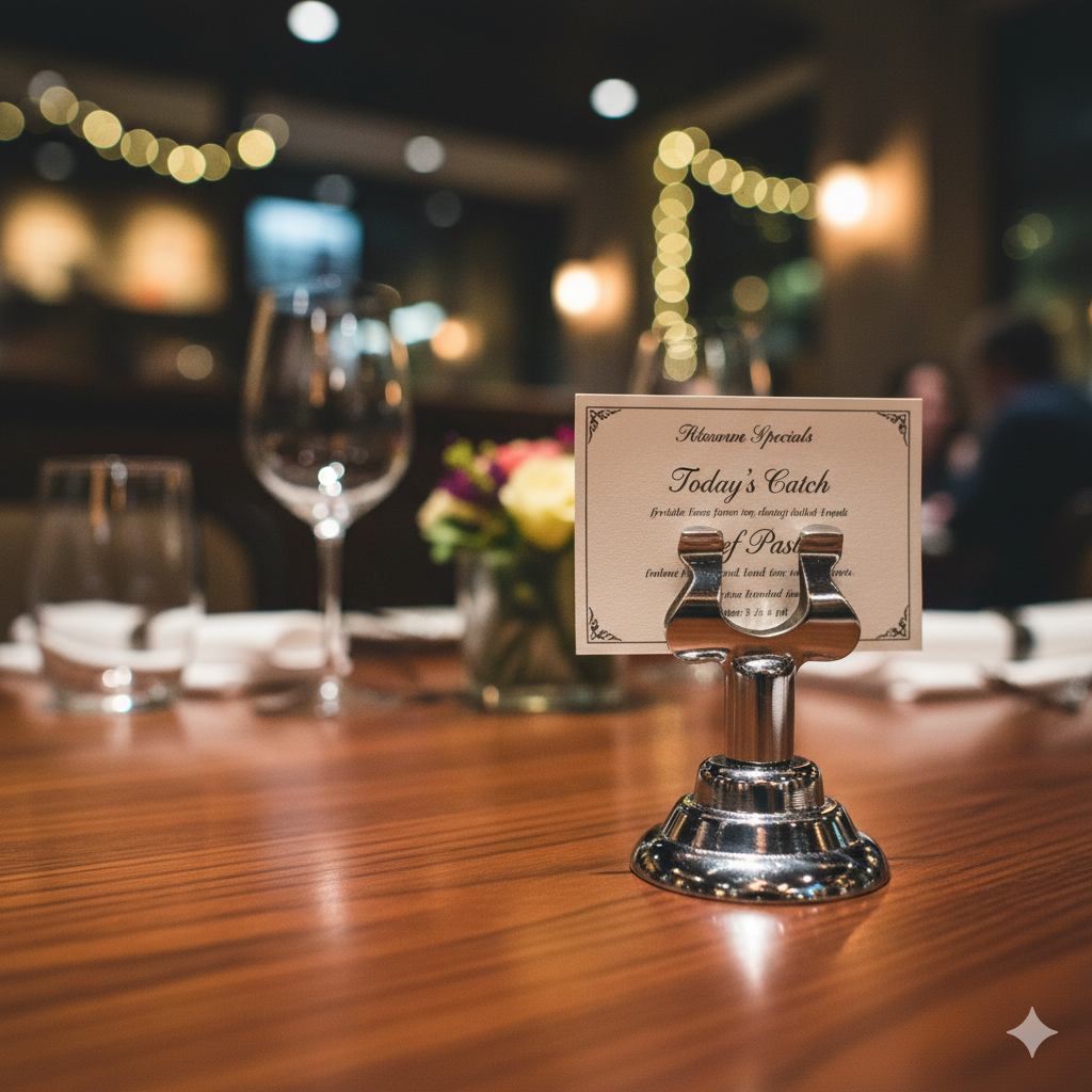 Description: Harp Clip Menu Holder, 1"W x 1"D x 1-1/2"H, heavy cast base