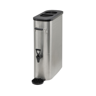 Description: Iced Tea Dispenser, 5 gallon, 6-7/8"W x 18-7/8"D x 21-1/4"H, welded front handle, detachable drip tray, includes: (3) color decals: "Iced Tea," "Lemonade," "Iced Coffee" and (1) blank decal, stainless steel