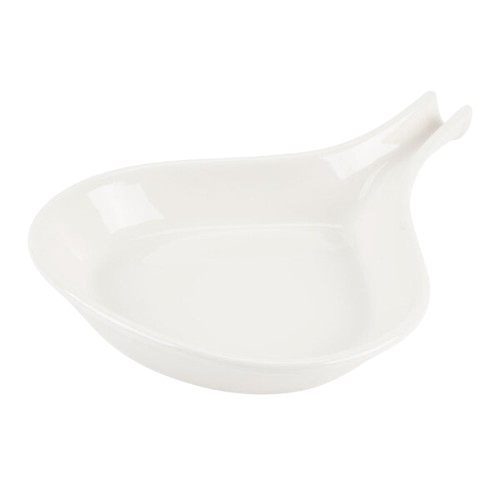 Description: Festiware Fry Pan Server, 18 oz., 10"L x 8-1/4"W x 1-1/4"H, pear shape, with handle, dishwasher, oven and microwave safe, stoneware (ceramic), American White