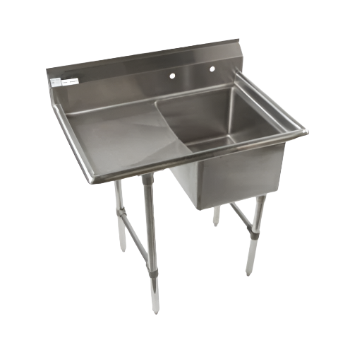 Description: Economy Sink, one compartment, 36-1/2"W x 25-1/2"D x 41"H, 18/304 stainless steel construction, 16"W x 20" front-to-back x 11" deep compartment, 9"H backsplash, 18" left drainboard, 8" O.C splash mount faucet holes, stainless steel gussets, legs, crossbracing, & adjustable bullet feet, ETL