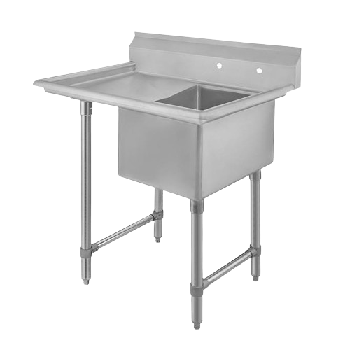 Description: Elite Sink, one compartment, 44-1/2"W x 29-1/2"D x 41"H, 16/304 stainless steel construction, 24" x 24" x 14" deep compartments, 9"H backsplash, 8" OC splash mount faucet holes, 18" drainboard on left, stainless steel legs & feet, ETL