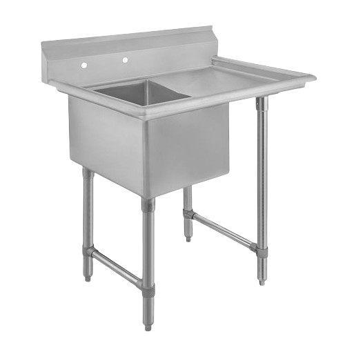 Description: Elite Sink, one compartment, 50-1/2"W x 29-1/2"D x 41"H, 16/304 stainless steel construction, 24" x 24" x 14" deep compartments, 9"H backsplash, 8" OC splash mount faucet holes, 24" drainboard on right, stainless steel legs & feet, NSF
