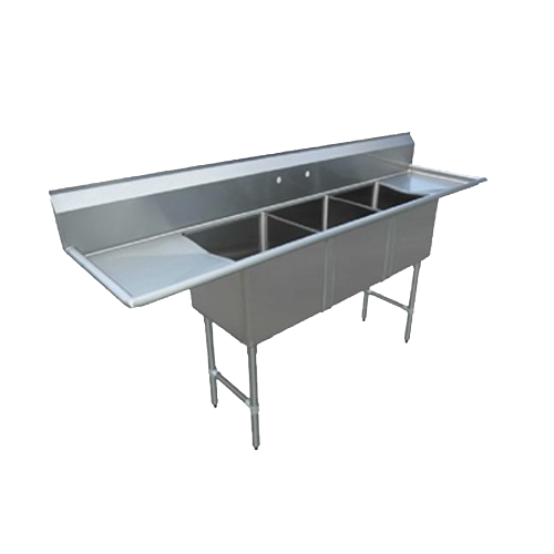 Description: Sink, three compartment, 75"W x 20-1/2"D x 43-3/4", 18/304 stainless steel construction, (3) 15" x 15" x 12" deep compartments, 8-1/2"H backsplash, (2) 15" drainboards, 8" OC splash mount faucet holes, stainless steel, NSF
