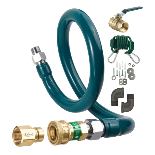Description: Royal Series Moveable Gas Connection Kit, 3/4” I.D., 48” long, stainless steel corrugated tubing & radial wrap with green antimicrobial PVC coating, quick disconnect, (1) full port gas valve, (2) 90° elbows, restraining cable with mounting hardware, 180,000 BTU/hr minimum flow capacity