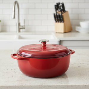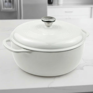 Description: Dutch Oven, 6 quart, 11-3/5" dia. x 6"H (exterior), round, cover with stainless steel knob, refrigerator/gas/electric/ceramic/induction/oven safe up to 500°F, dishwasher safe (hand wash recommended), porcelain enameled cast iron, off-white interior/lagoon exterior