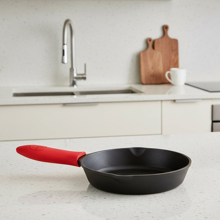 Description: Mini Hot Handle Holder,4-1/3"L, heat protection up to 450°F, dishwasher safe, silicone, red, BPA Free (fits Lodge handles 9" & smaller)